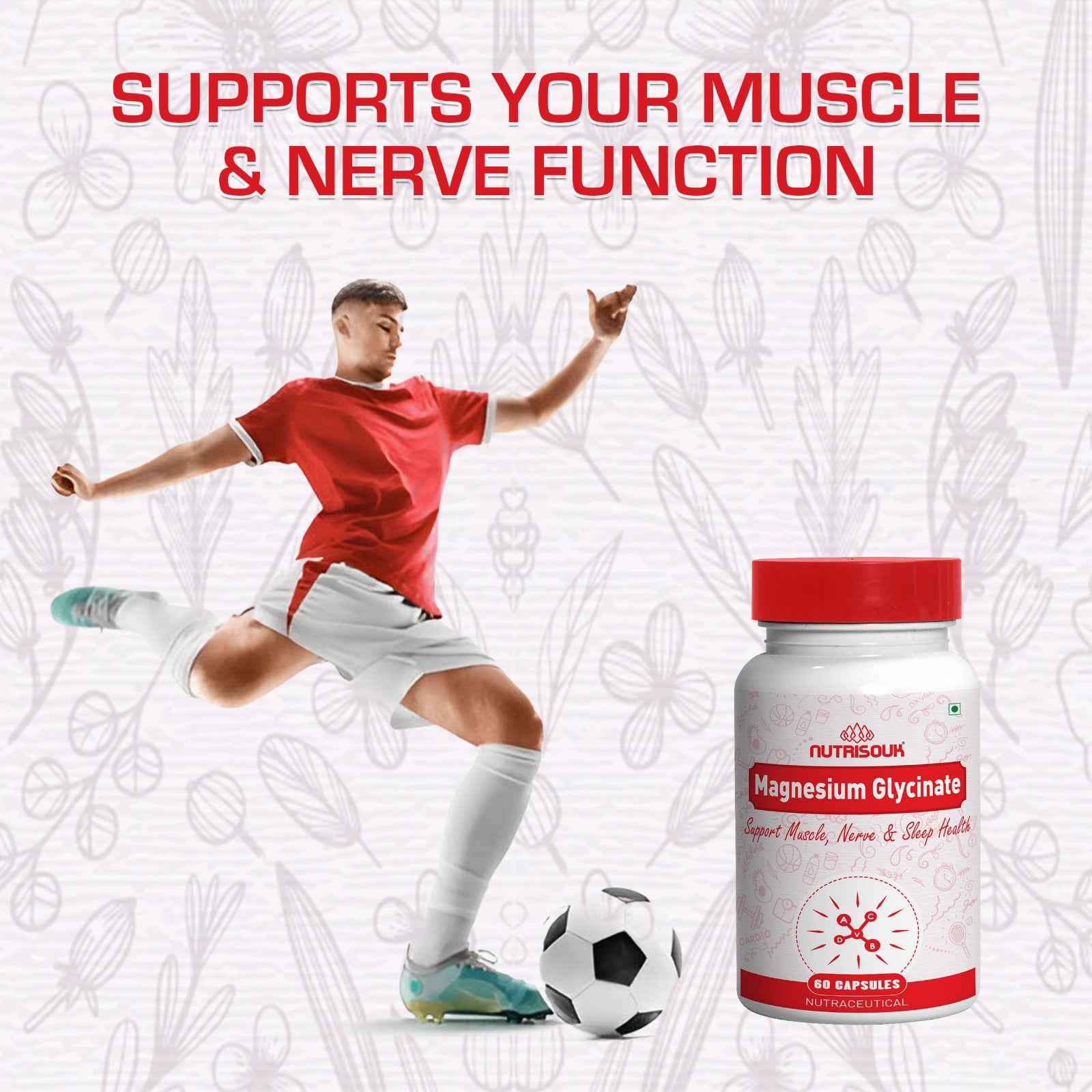 Nutrisouk Magnesium Glycinate Capsule provides a highly bioavailable and gentle form of magnesium, designed to support overall wellness without the laxative effect associated with other magnesium forms. Each capsule delivers elemental magnesium bound to glycine, an amino acid known to promote calmness and better absorption.
