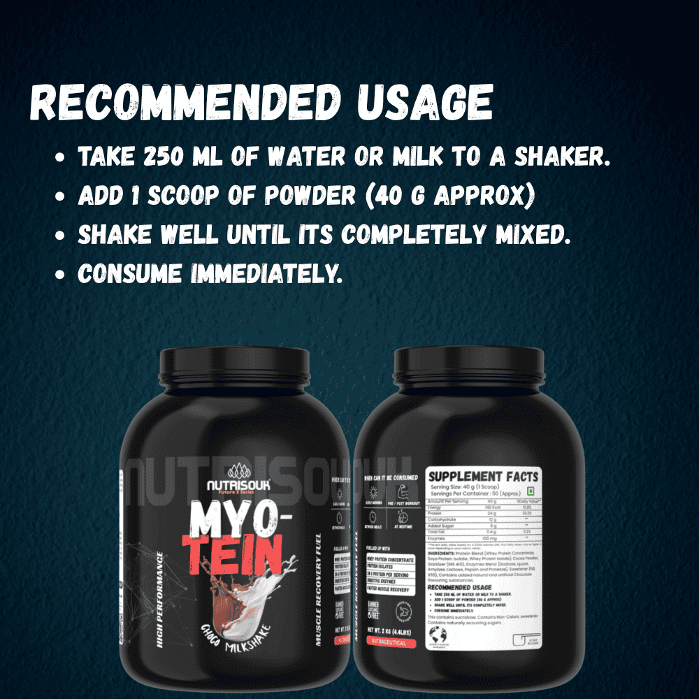 Nutrisouk’s MyoTein is a premium whey protein formula crafted for those who demand quality, performance, and faster results. Each serving delivers 24 grams of high-quality protein, combining the strength of Whey Protein Concentrate and the purity of Whey Protein Isolates, making it the ideal choice for athletes, bodybuilders, and fitness enthusiasts aiming for lean muscle growth and speedy recovery.